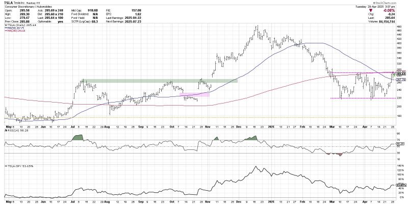 After peaking in December 2024 around $480, TSLA dropped to a March 2025 low around $220. From there, the price has rotated between the 200-day moving average as resistance and that $220 level as support. To be clear, the countertrend rallies in March and April have been impressive, but they have not yet provided enough upside pressure to propel Tesla back above the crucial 200-day moving average.